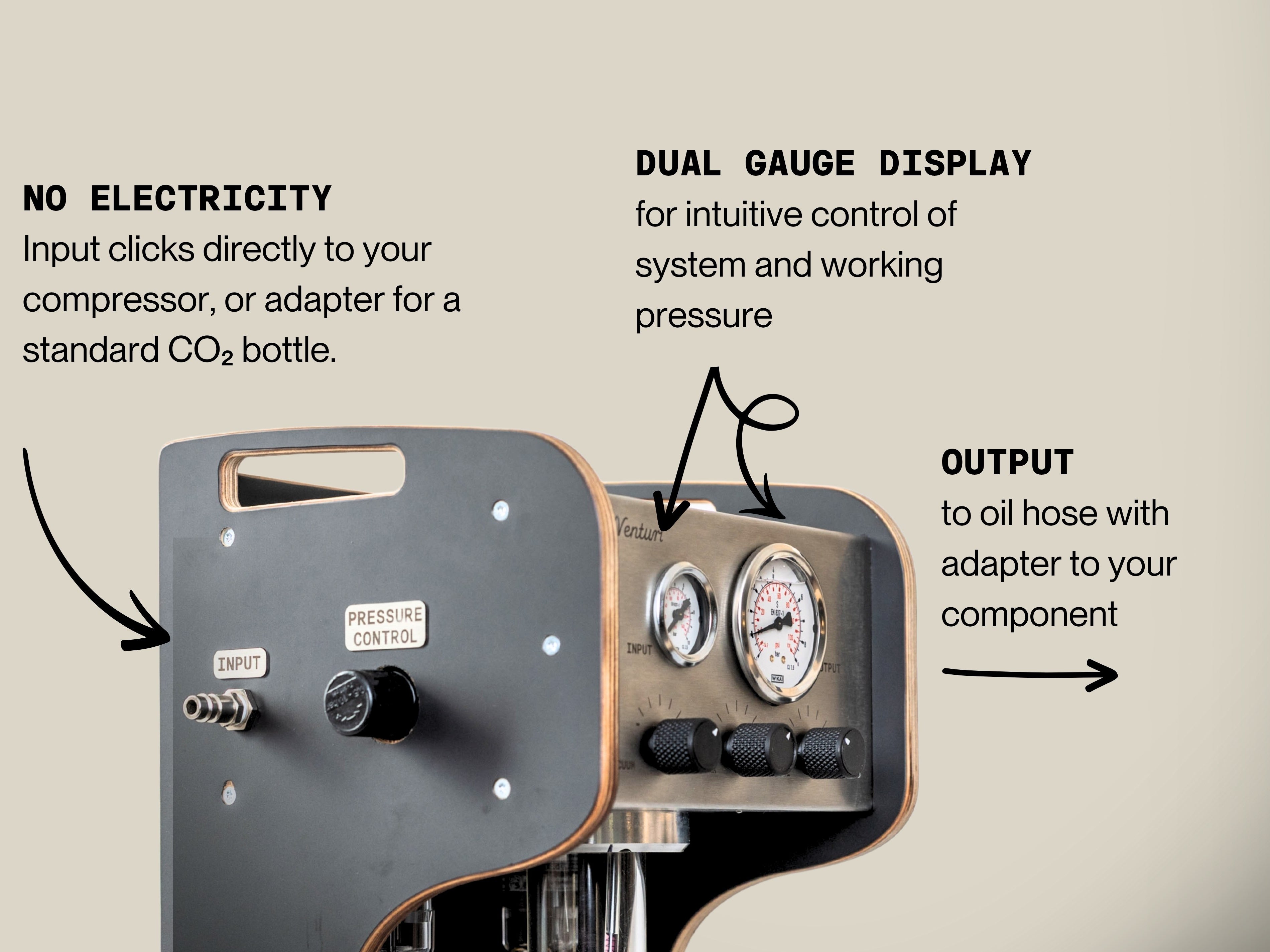 - Vaccum Bleeder - Choose if you have a compressor or you want a CO2 connection. Each Veturi comes with one tank and one Oil hose.