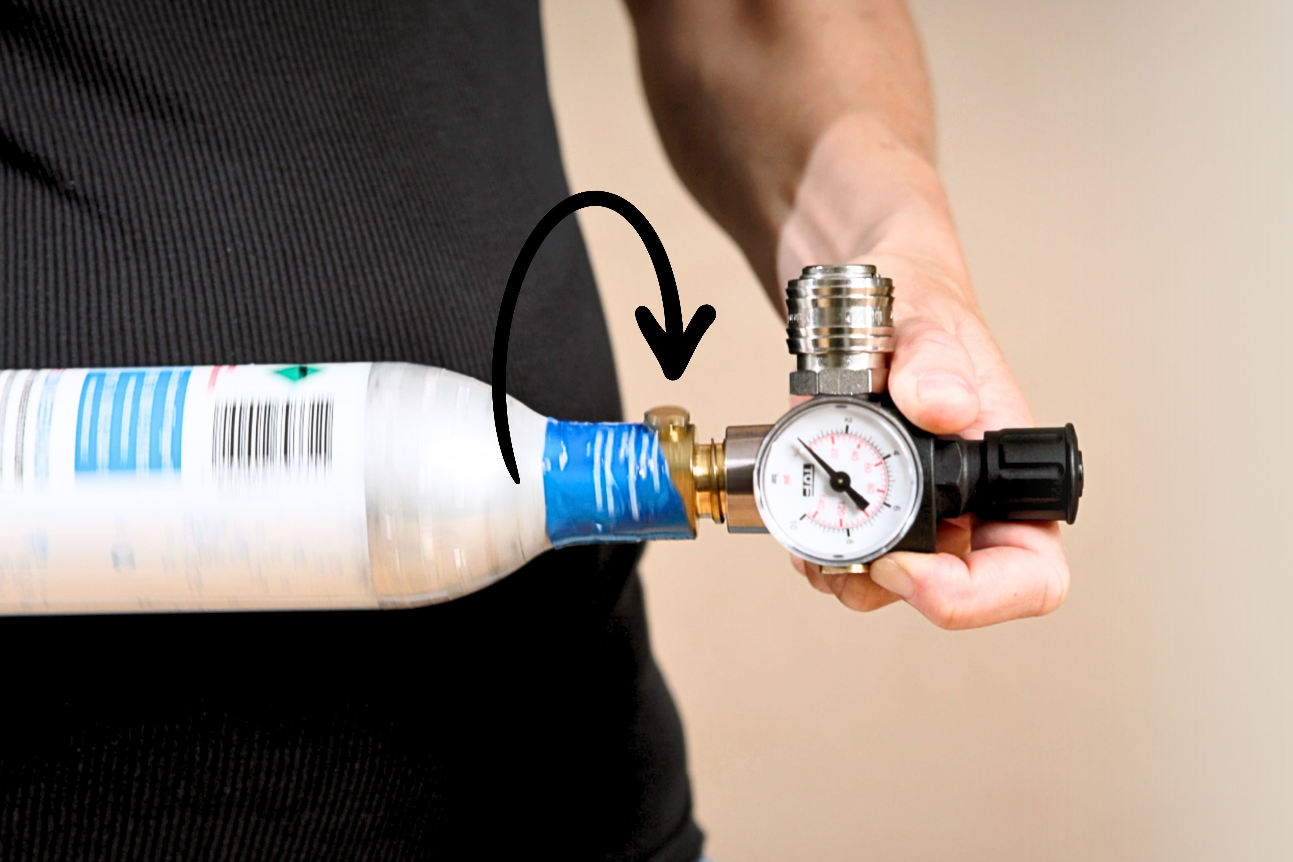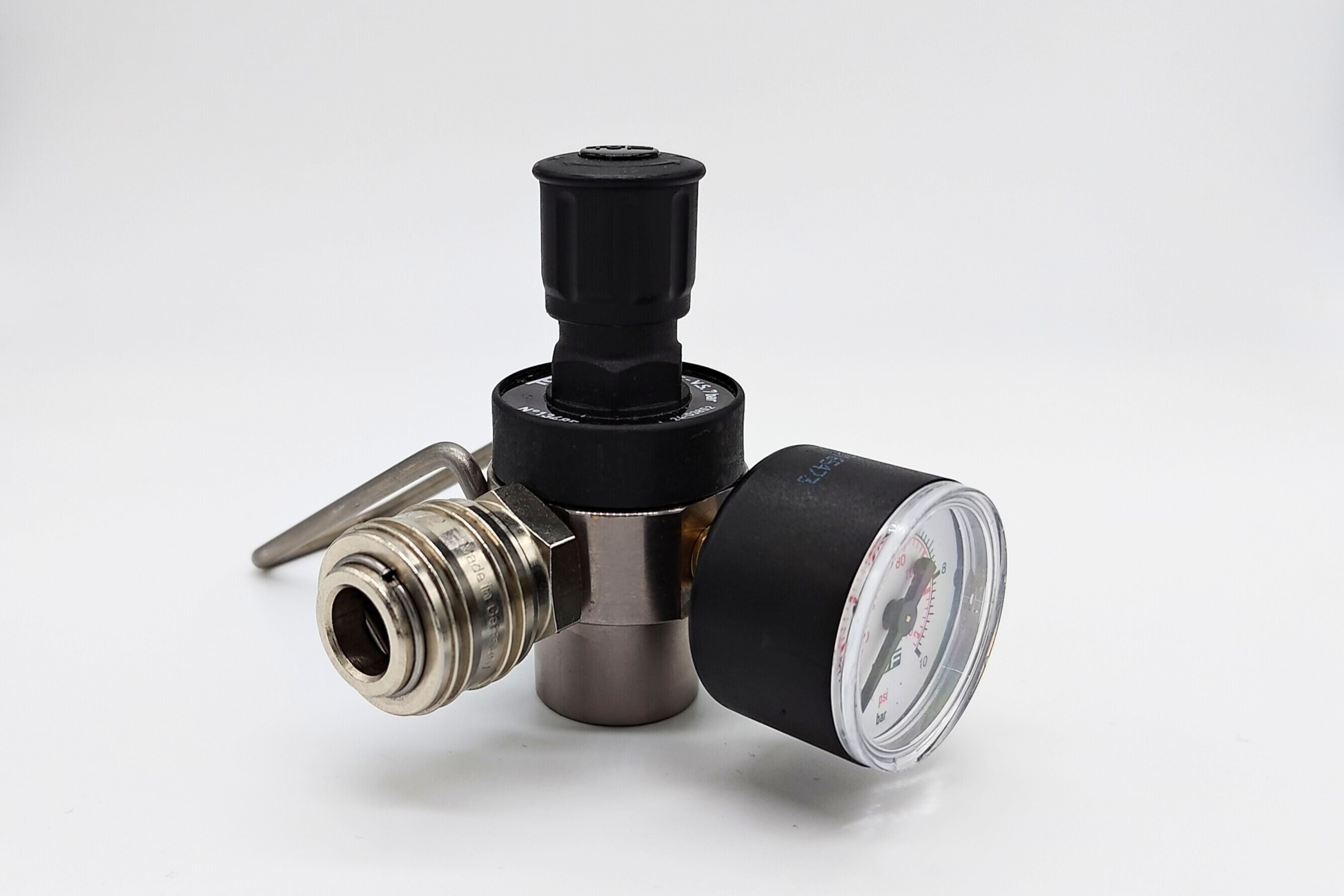 Engineered for precise CO₂ control, this pressure reducer features a rugged NW7 quick coupling and ACME thread compatible with standard SodaStream cylinders. The built-in gauge shows real-time bottle pressure, while the adjustable regulator allows exact control up to 7 bar.