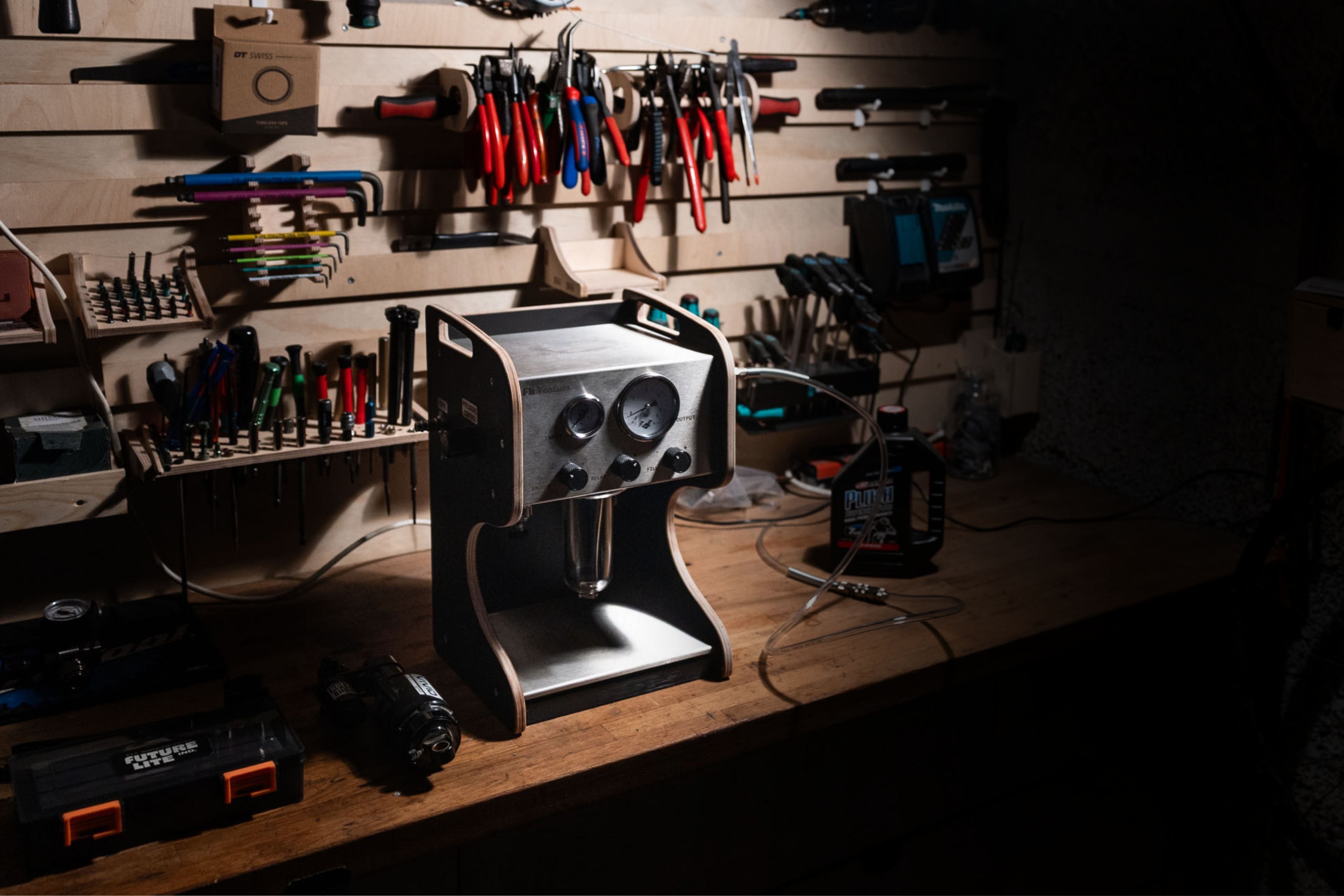 The VENTURI is your all-in-one tool for MTB suspension service. Whether air shock, coil shock, or fork cartridge — you can vacuum-bleed and refill your components with precision. All fully pneumatic, powered only by compressed air or CO₂, with no electricity required.